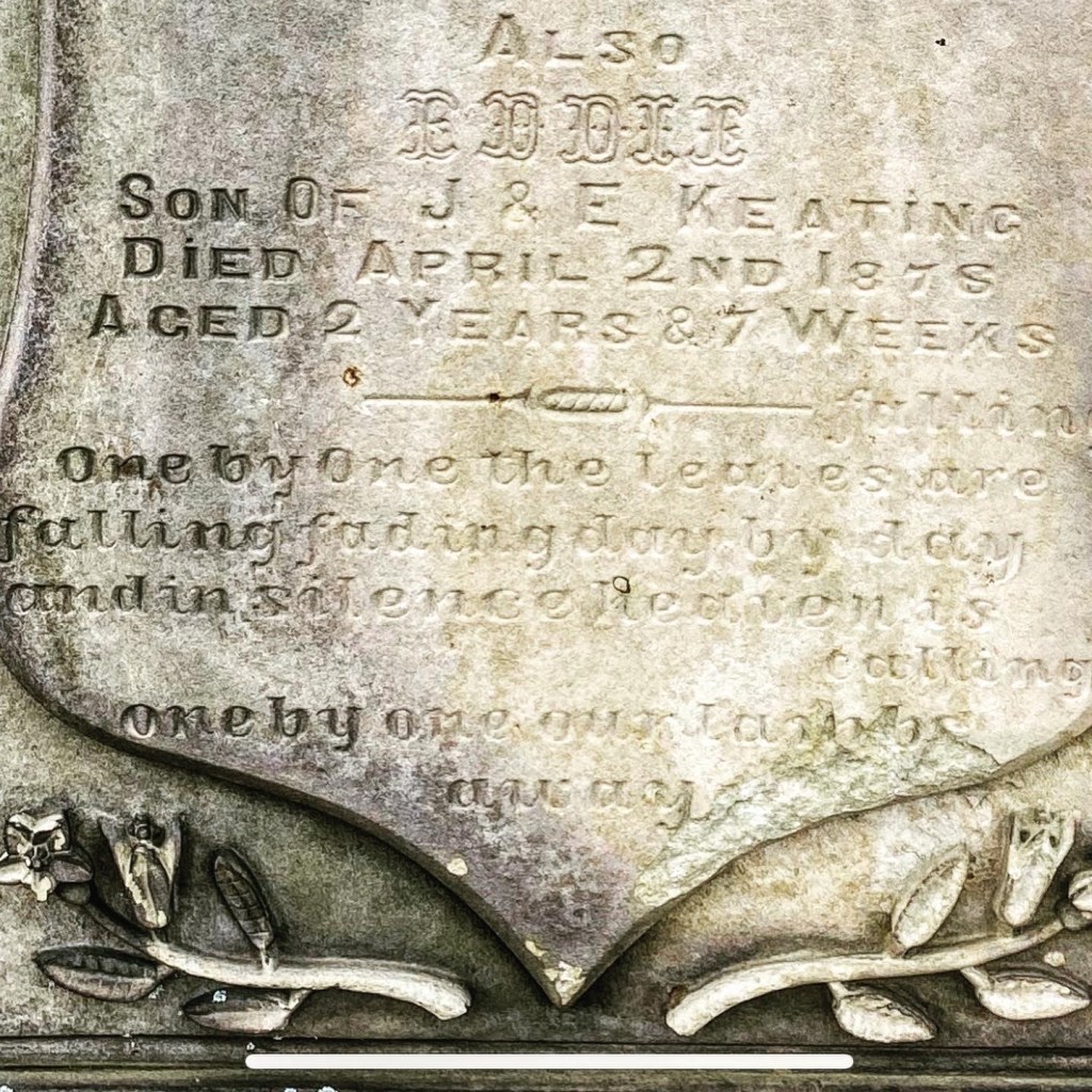 Eddie Keating is the second child of John and Ellen Keating. He was born in around February 13, 1874, six years after Mary Julia passed away. He died on April 2, 1878 at the age of two years and seven weeks. His death is commemorated on the dollhouse directly below his sister’s.