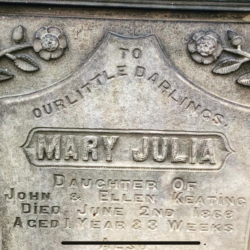Mary Julia was the first child of John and Ellen (McCarren) Keating. She was born May 12, 1867, and passed away on June 2, 1868 at the age of 1 year and three weeks.