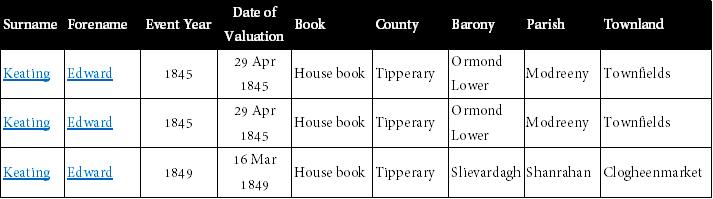 Just as the Keating family’s life between their arrival in 1850 and their residence in St. Louis in 1860 is a mystery, nothing is known of the Keating family’s life in Ireland, either. Only two Tipperary records turned out in the time period 1800-1850 for an Edward Keating. These are from (land) Valuation Office books. Edward and Honora’s oldest was born in 1840, and they left Ireland for the United States in 1850. Because we do know (1) the Keatings were likely from Tipperary; (2) “Edward Keating” was a surprisingly uncommon name in Tipperary at that time; and (3) the only records for an Edward in Tipperary are in the 1840’s when Edward would have been starting a family, there is a good chance that either or both of the Townfields and Clogheenmarket records are valuation records of our Edward Keating.