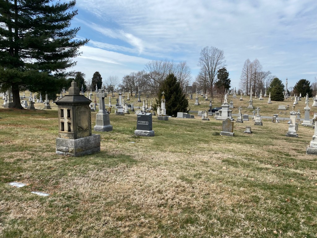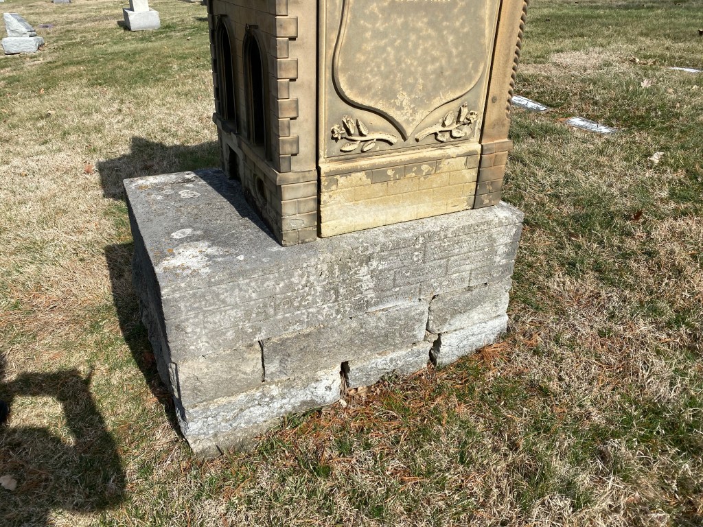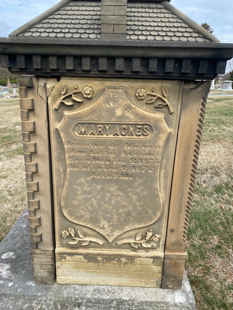 One of the most notable characteristics of the Keating Dollhouse is its warm color. Amidst a sea of mid to late-1800’s monuments made primarily out of the cool-toned white Vermont marble, the Dollhouse’s warm sandstone stands out. Due to the limitations on transportability of stone in the early 1800’s, monuments were most often made out of locally-sourced materials. The construction of railroads connecting freight routes to Cincinnati in the 1850s and 1860s allowed for the importing of marble from the eastern part of the country. Marble quickly became a more popular material for use on gravestones at that time, as is evident when you look around the section of late 1800’s gravestones in which the Dollhouse is located.