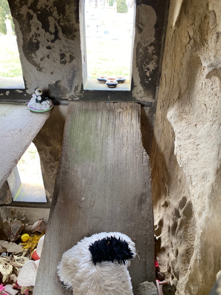 The roof of the Dollhouse is also made of sandstone, dyed black with an unknown substance. Mark Smith, the gravestone conservator that has been reviewing the monument for restoration, mentioned that it is likely some kind of black vegetable dye.