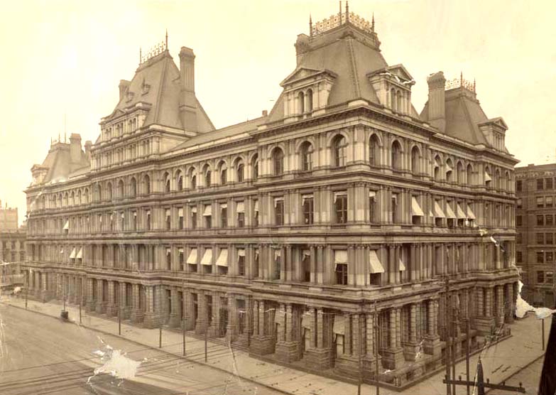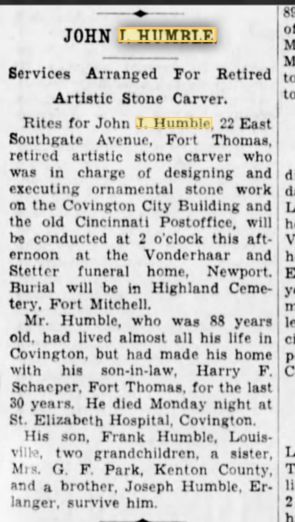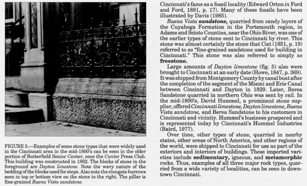 While sandstone fell out of favor for use on gravestone monuments during the second half of the 19th century, it continued to be a popular material for use on Cincinnati buildings and decorative wrought-iron fence pillars. Cincinnati buildings of the era were often constructed with “Buena Vista” sandstone from northern Ohio. This stone was also referred to as, “freestone”. Nobody can say for certain why John Keating chose to use sandstone for the Dollhouse, but it is likely because of his familiarity with this material in his line of work. Around the time of the construction of the dollhouse, John worked for the J. Humble and Company stonecutters. J. Humble and Company was specifically in the “freestone business.” J. Humble (and presumably, those who worked for him such as John Keating) are responsible for the artistic stone carvings found on the since-demolished Covington City Building and the Cincinnati Post office.